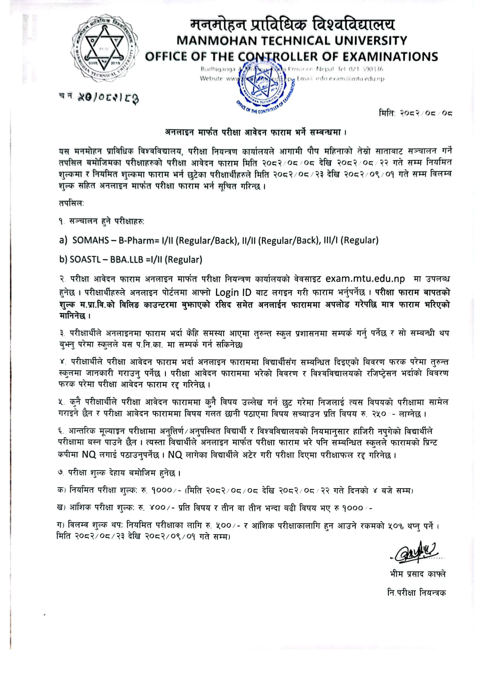 • 2082-08-08 - Examination Form Open (B.Pharm. I/II, II/II, III/I and BBA.LLB I/II)