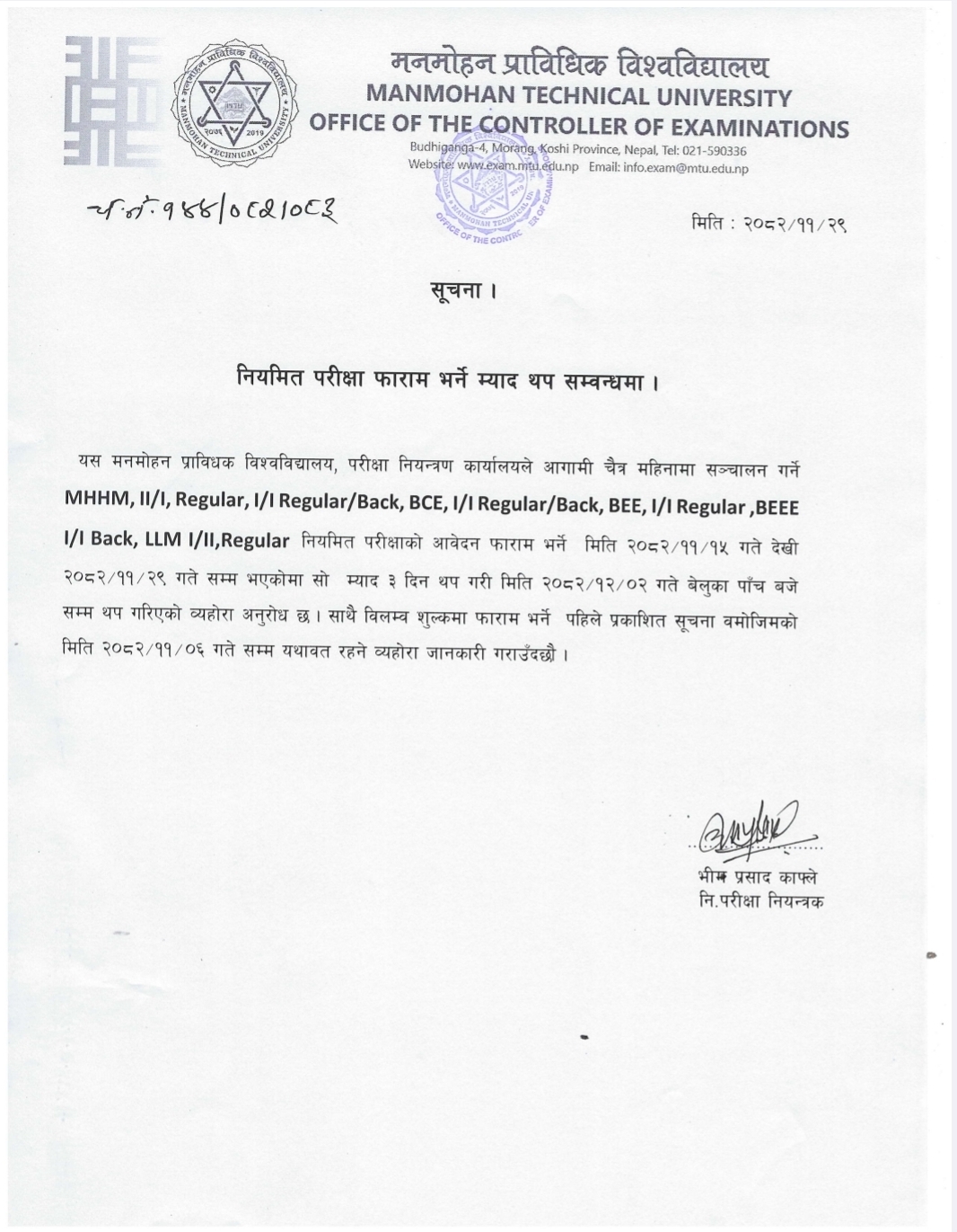 2082-11-29 परीक्षा फाराम भर्ने म्याद थप सम्वन्थी सूचना